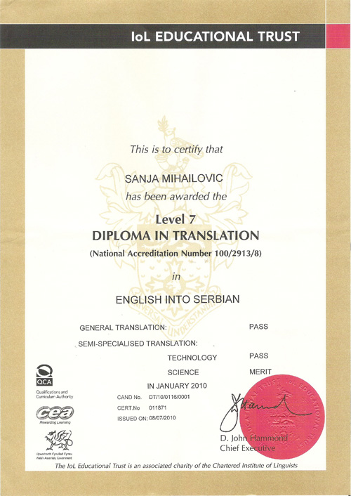 CIOL DipTrans MCIL, Science and Technology, Chartered Institute of Linguists, UK (EN > SR)